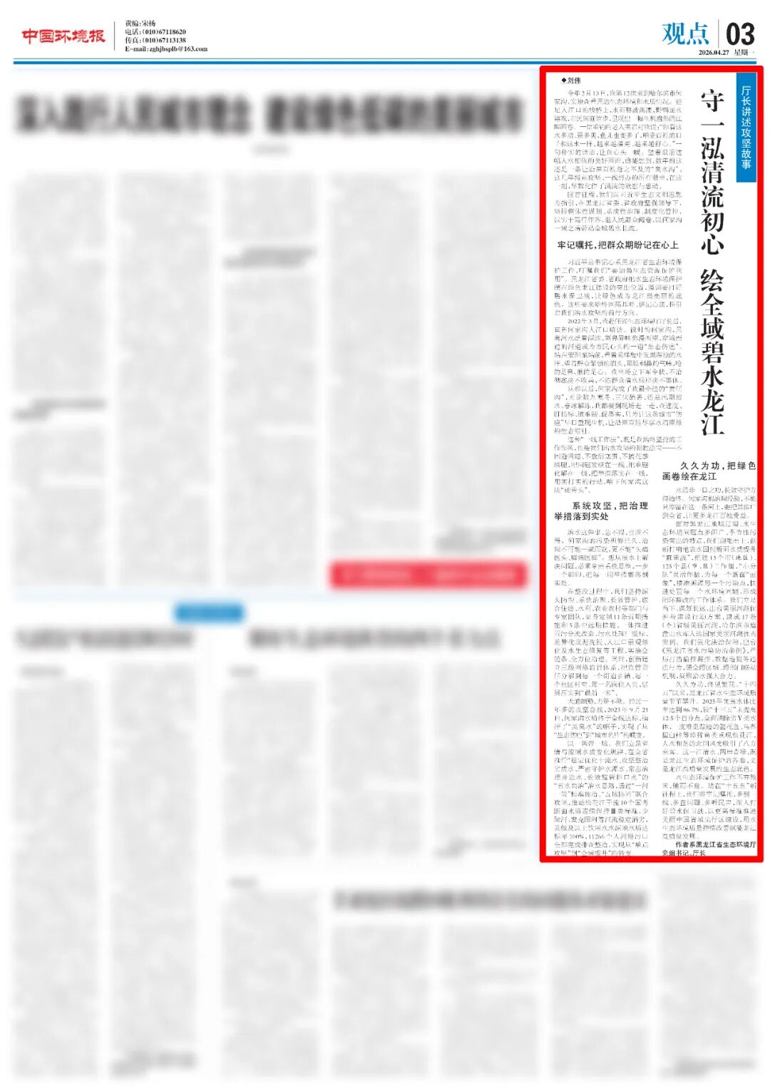 习近平总书记心系黑龙江省生态环境保护工作,叮嘱我们“要加强生态资源保护利用”。黑龙江省委、省政府把水生态环境保护摆在绿色龙江建设的突出位置,强调要打好碧水保卫战 ,让绿色成为龙江最亮丽的底色。这些要求始终回荡耳畔、铭记心底,指引着我们治水攻坚的前行方向。