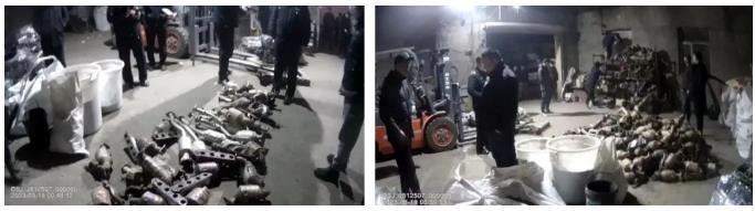 2023年3月19日,针对刘某非法从事收集、贮存、处置危险废物经营活动的问题线索,在省生态环境保护综合行政执法局、省公安厅食药环侦总队指导及组织下,哈尔滨市生态环境保护综合行政执法局、哈尔滨市香坊生态环境局会同哈尔滨市公安局、香坊公安分局开展联合现场调查。经查,刘某利用剪压、粉碎、球磨等设备,从事废旧三元催化器收集处置活动,现场查证三元催化剂粉末及未拆解三元催化器1.85吨、已拆解三元催化剂壳体2.4吨。