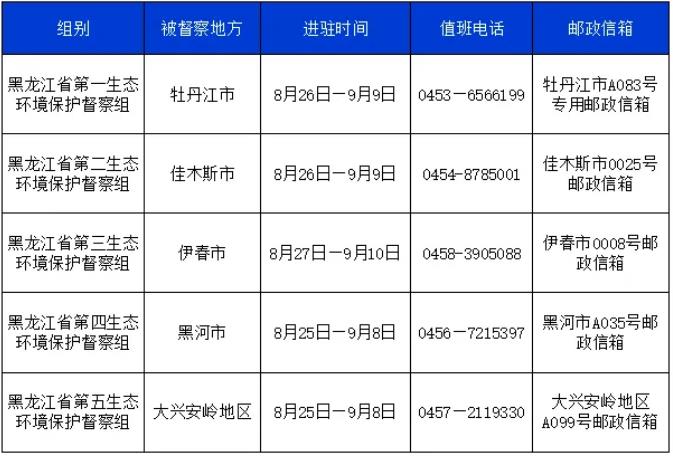 经省委、省政府批准,8月25日至27日,黑龙江省五个生态环境保护督察组已全部进驻,将对牡丹江市、佳木斯市、伊春市、黑河市、大兴安岭地区开展为期15日的生态环境保护督察工作。