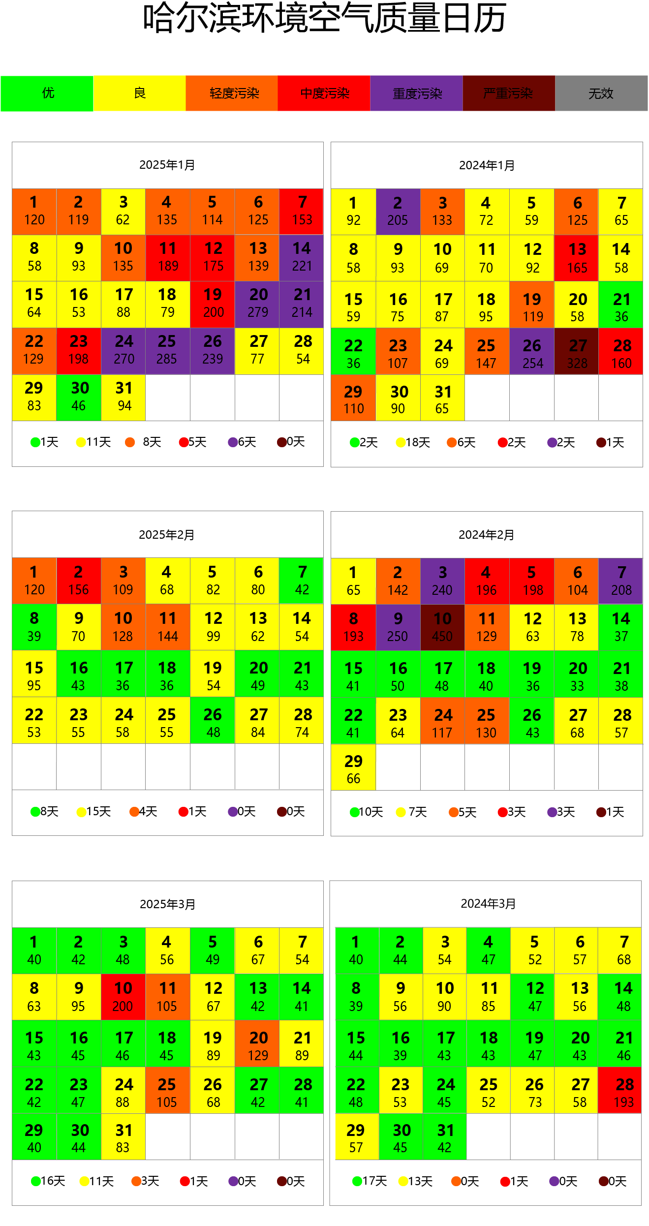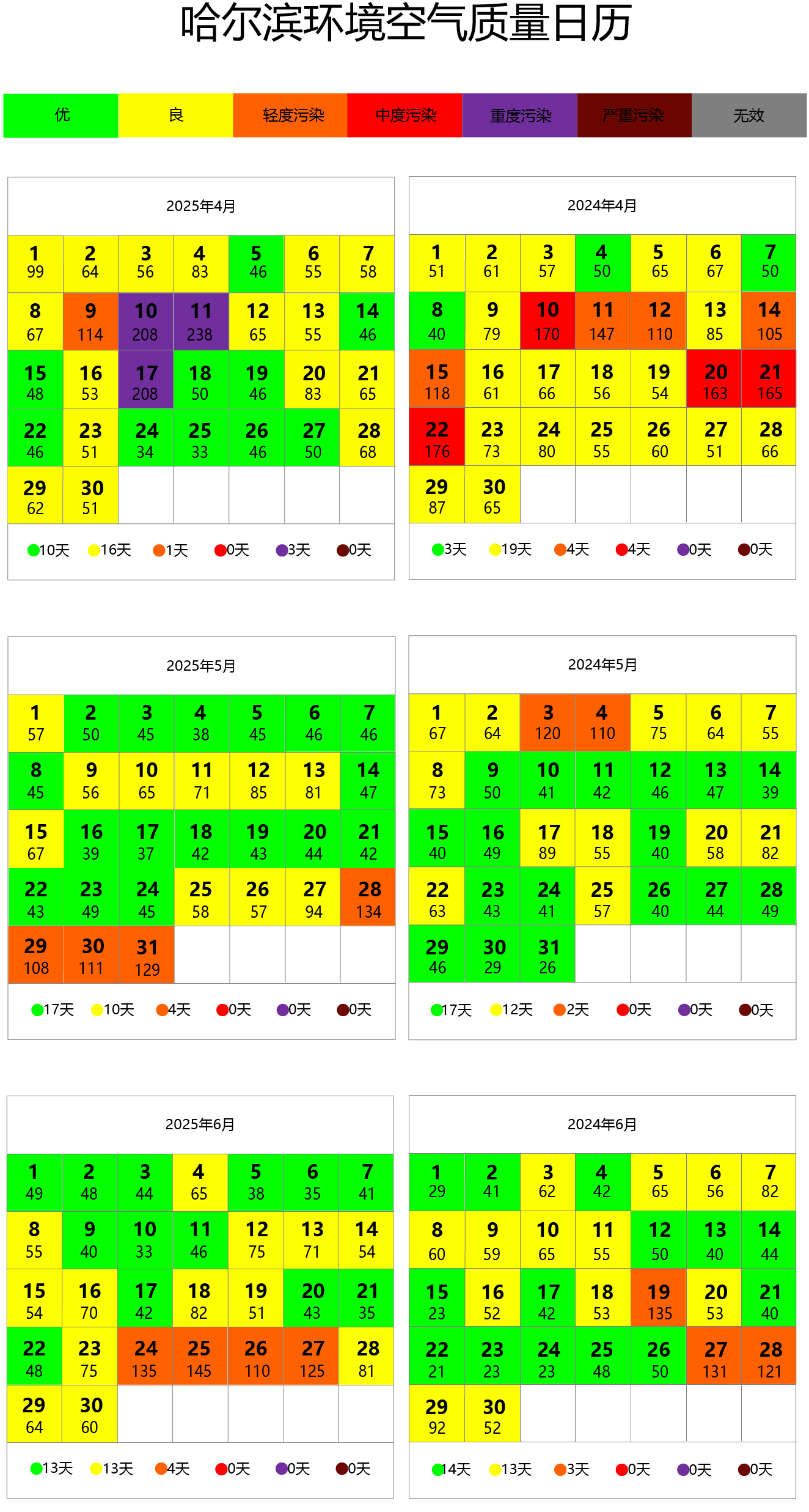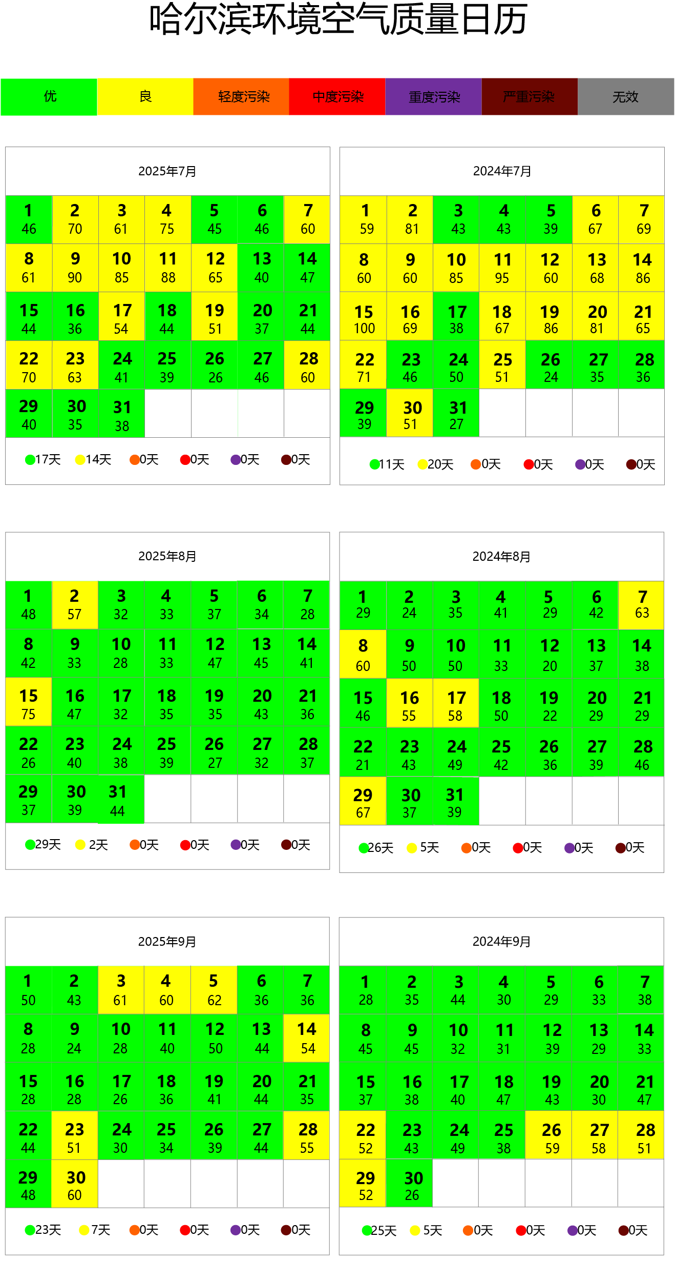 2025年9月,哈尔滨优良天数为30天,优良天数比率为100%,同比不变。详见哈尔滨环境空气质量日历。