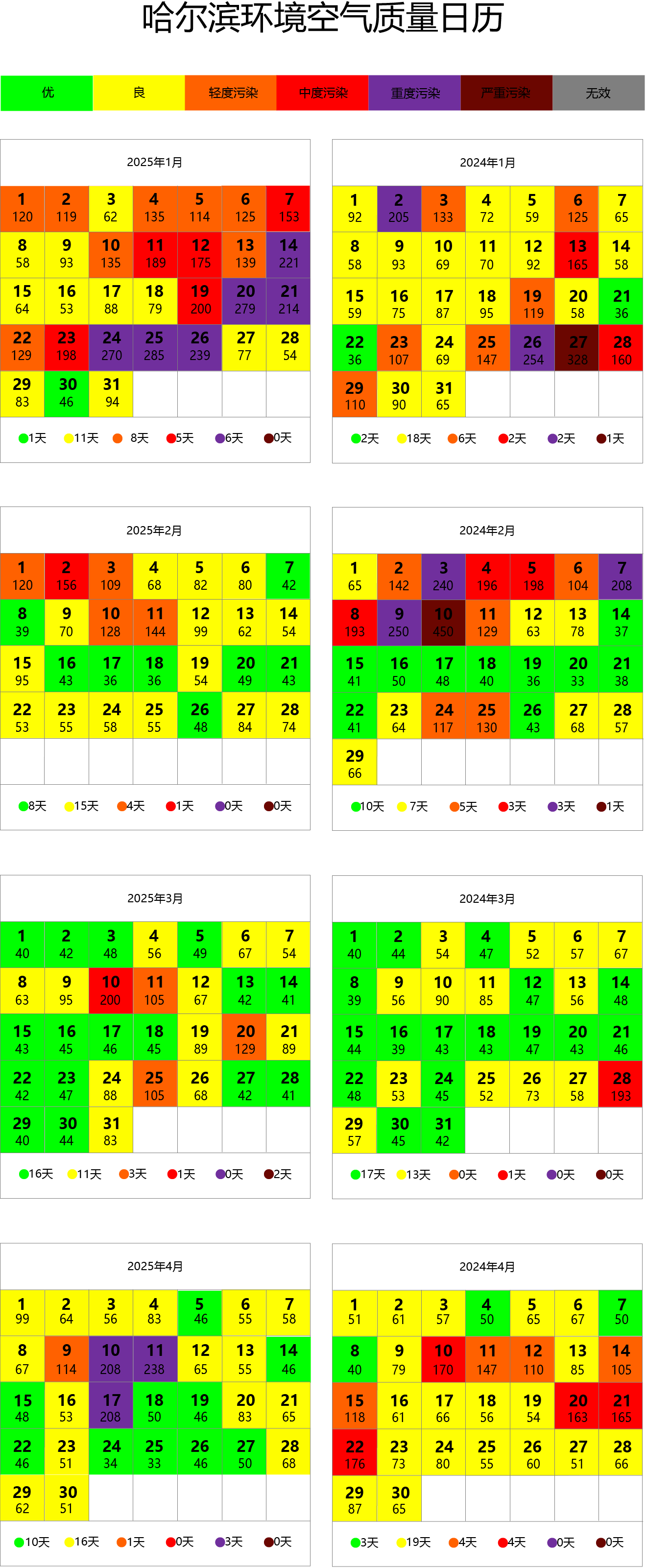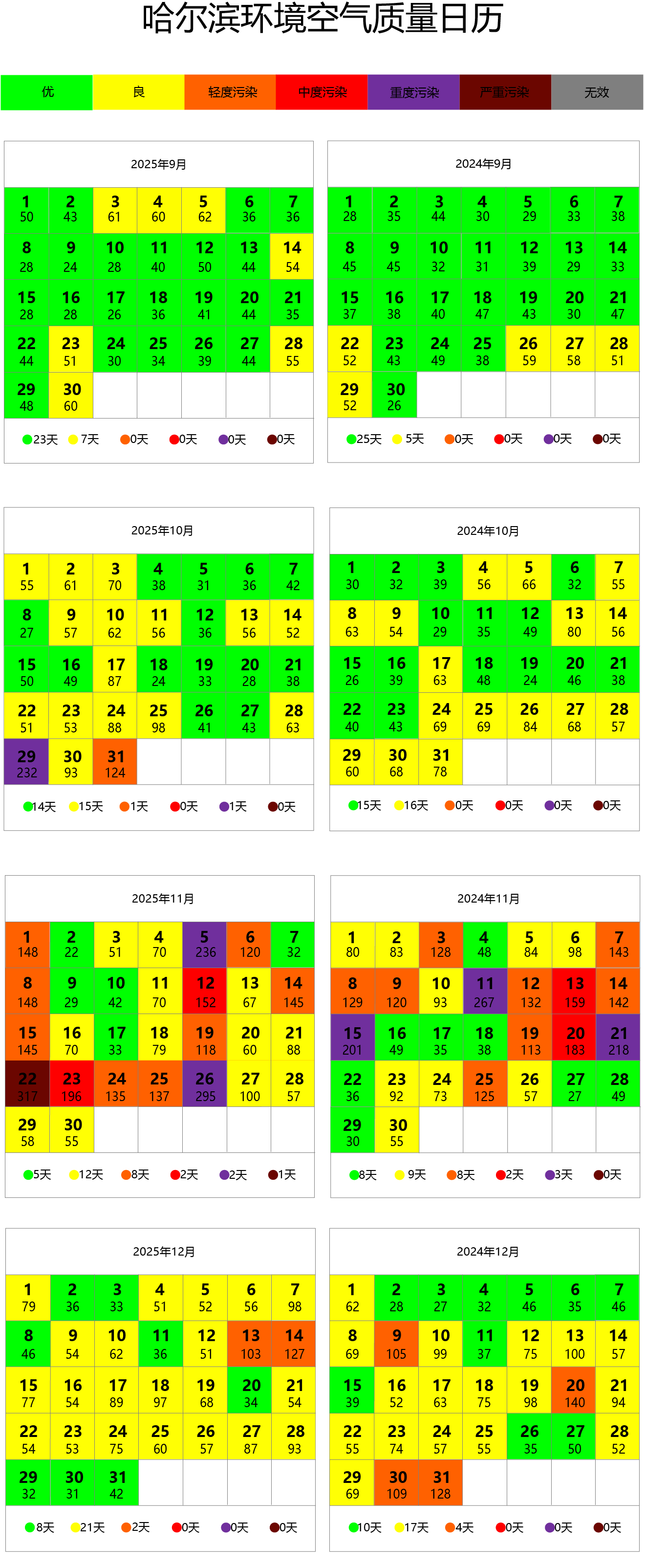 2025年12月,哈尔滨优良天数为29天,优良天数比率为93.5%,同比升高6.4个百分点。详见哈尔滨环境空气质量日历。