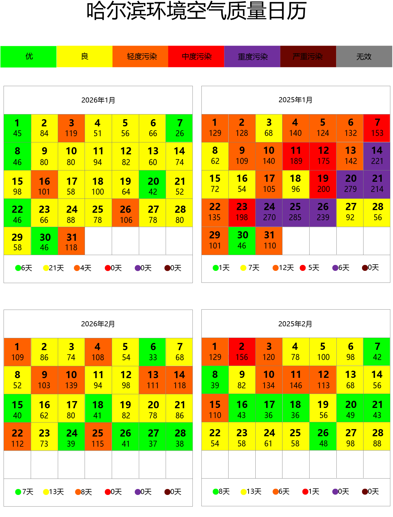 三、省会城市哈尔滨环境空气质量日历